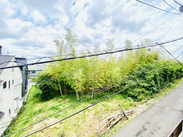 交通量の少ない前面道路です。向かい側には建物が無く緑が広がっております。